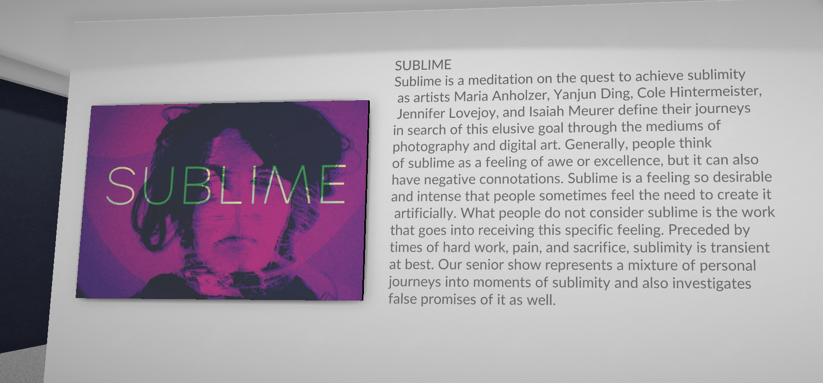 My capstone piece was the best example of my growth, though. From January to March, my group and I had been conceptualizing the exhibit, our pieces, the story we wanted to tell. We had decided on the idea of “Sublime,” the sort of magical feeling you get in an experience that is distinctly human. By March, we had some rough drafts of personal concepts, a solid concept, and a few prototypes of our projects. Then the lockdowns hit.